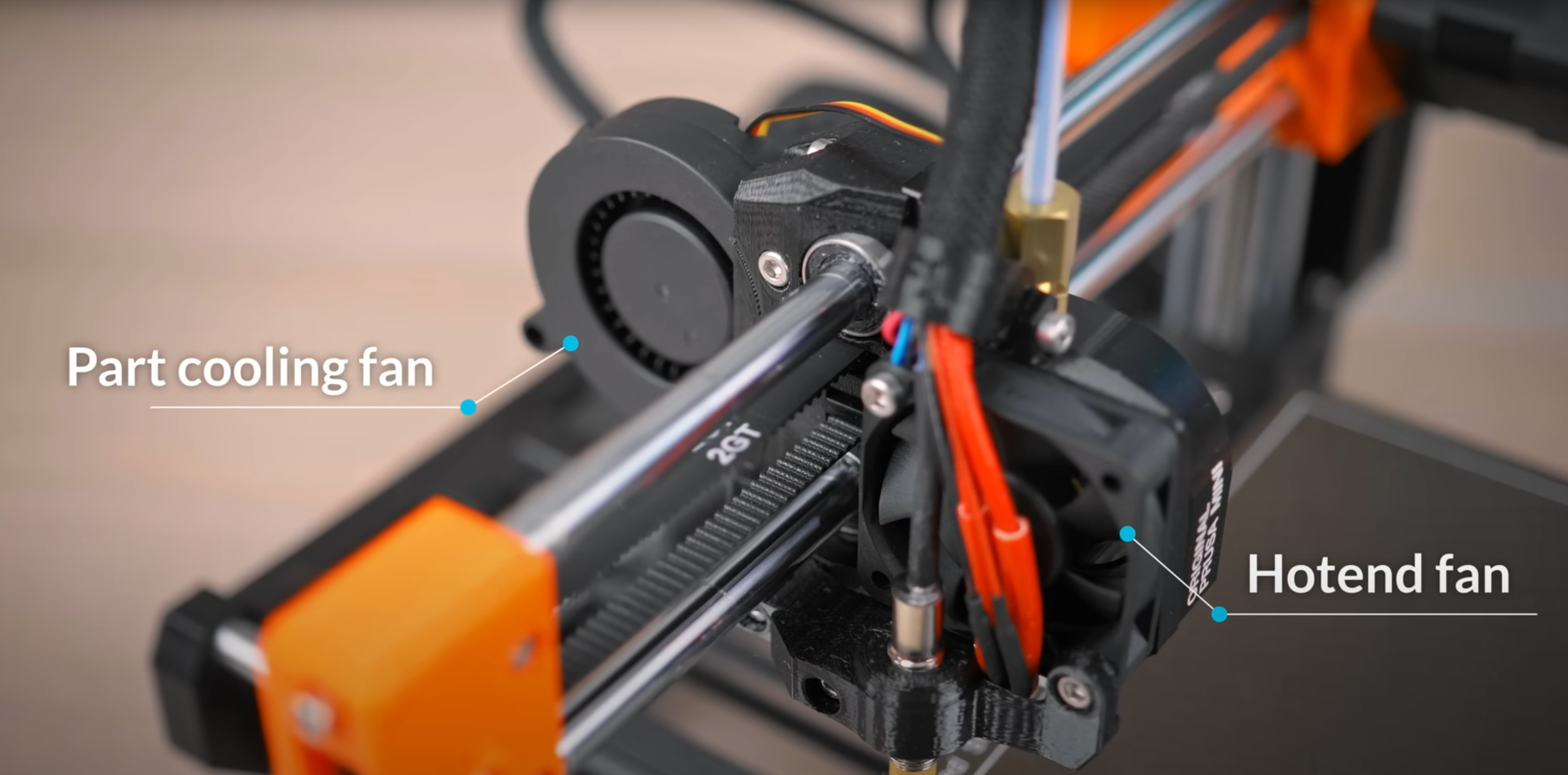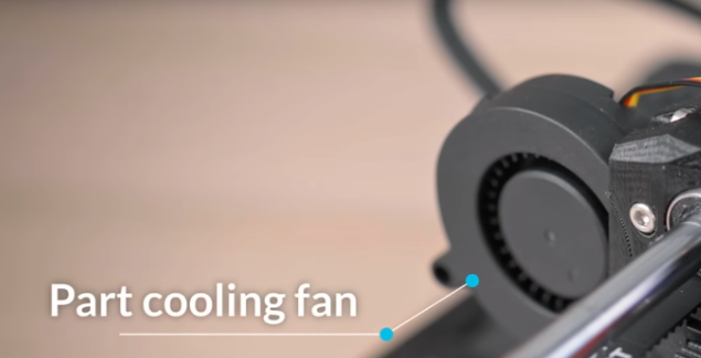 Blowing onto printed object, so filament can become solid as soon as possible. This is the determining factor on how well your printer does overhang and bridging. Part cooling fan should not be blowing into hot nozzle but under nozzle toward the part