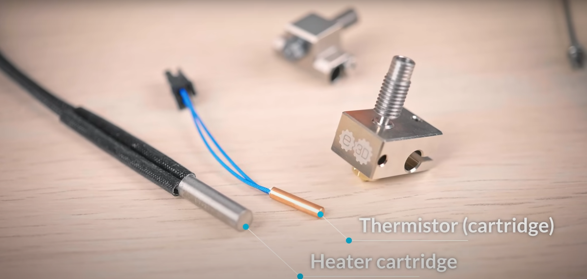 Heater cartridge is what provides the heating while the thermistor is reporting temperature back to the user