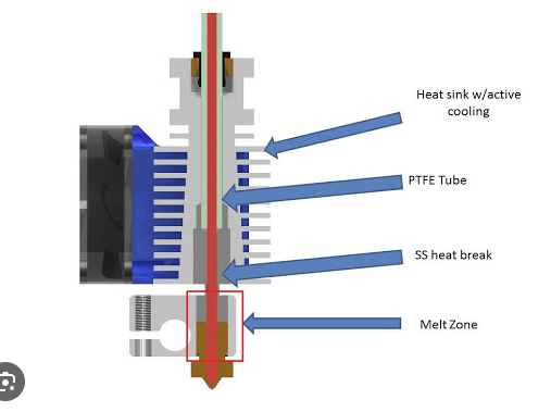 PTFE tube going past heat break and directly into heating element, DO NOT USE ABOVE 240C!!! Above 240 PTFE degrades and off gas neurotoxin