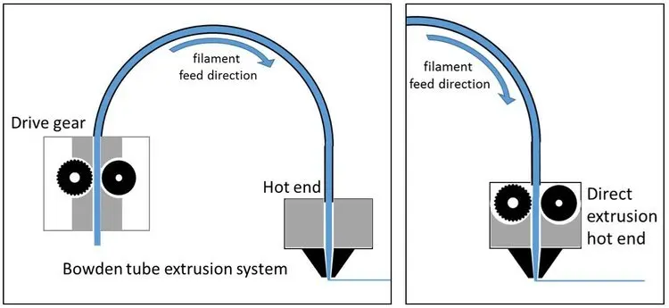 - Direct drive have drive gear inside hotend (1 single unit, more common now days)