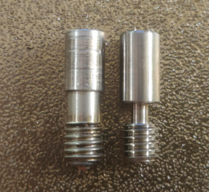 Left side is the PTFE tube going all the way down to the hot nozzle, note the part above the threading is very fat. VS. Right side after market heat break with a thinner neck, only allowing the filament go through, PTFE tube will stop at the cold part of the heat break. Thus reduce temperature and not melting PTFE